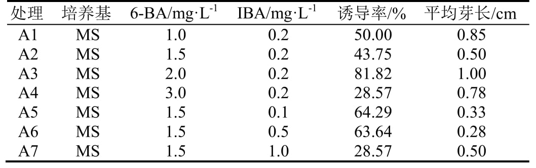 1.2.3 生长调节剂配比试验 将消毒外植体接种到按单因素多水平设计的不同生长调节剂配比的、添加0.5 g·L-1活性炭的MS培养基中,共计7组,分别为:IBA为0.2 mg·L-1,6-BA分别为1.0、1.5、2.0、3.0 mg·L-1;6-BA 为 1.5 mg·L-1,IBA 分别为 0.1、0.2、0.5、1.0 mg·L-1 (表 1)。每组 15 瓶,每瓶接 1个外植体,每3 d观察1次,15 d统计诱导情况。