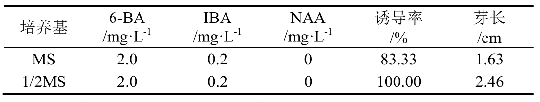 1.2.4 诱导培养基 得出芽诱导佳生长调节剂配方后,对比添加0.5 g·L-1活性炭的MS和1/2MS培养基的诱导效果,共2组,每组24瓶,每瓶接1个外植体,每4 d观察1次,20 d后统计诱导情况。