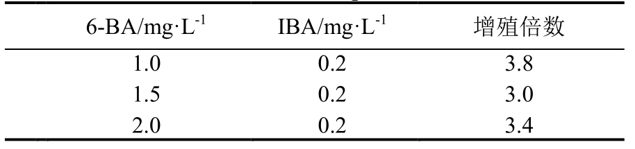 在芽增殖试验中,1.0 mg·L-1 6-BA 和0.2 mg·L-1 IBA的生长调节剂组合是较适合芽增殖的生长调节剂配比,这与研究结果相近,但他们认为芽增殖中6-BA佳浓度为2.0 mg·L-1。本研究中6-BA浓度为1.0、1.5、2.0 mg·L-1的芽增殖系数均达3倍以上,并以1.0 mg·L-1时增殖倍数大,小芽长势好。