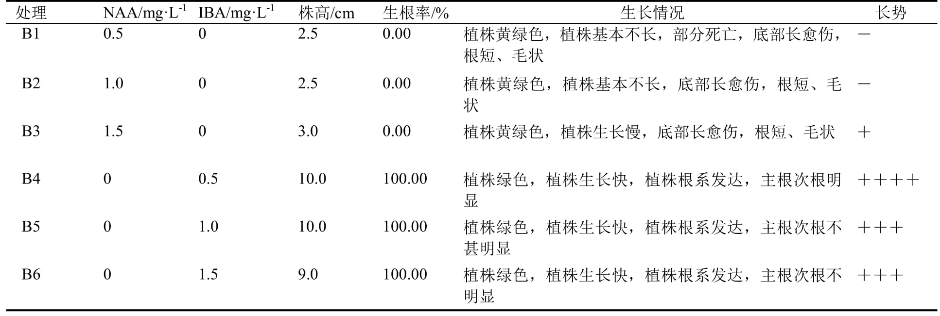 注:基本培养基为1/2MS;“-”表示差,“+”表示一般,“++”表示好,“+++”表示较好,“++++”表示好。