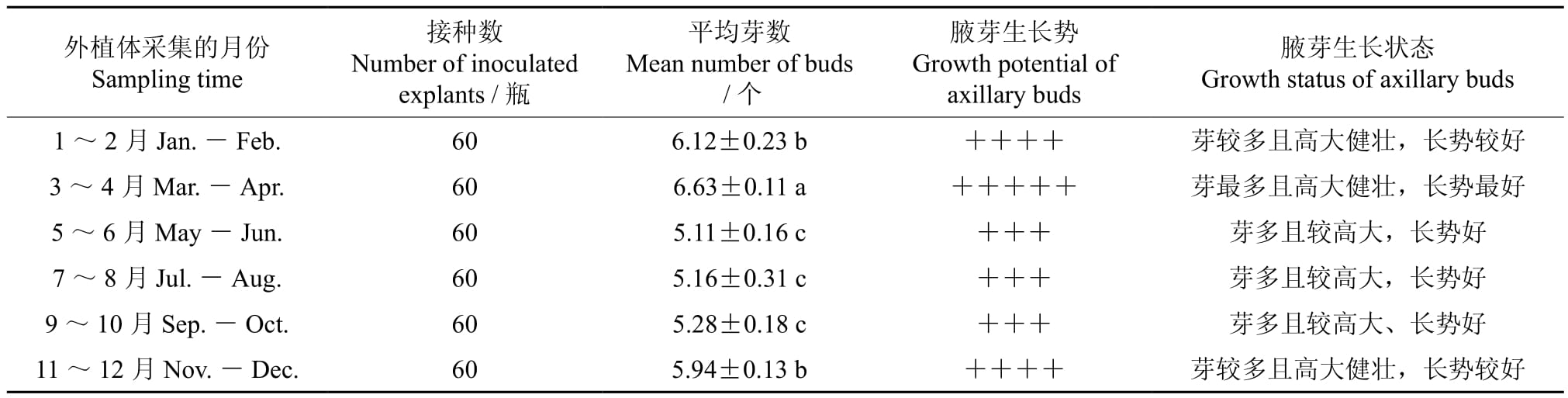 表1 外植体的不同采集时间对其腋芽萌发的影响†