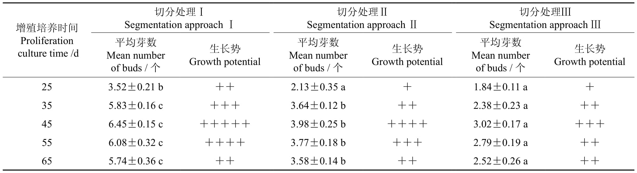† 同行数据后的不同字母表示在0.05水平上差异显著,平均芽数为3次重复的平均值±标准误差,用“+”号表示腋芽的生长趋势,“+”号越多表示其生长势越好。