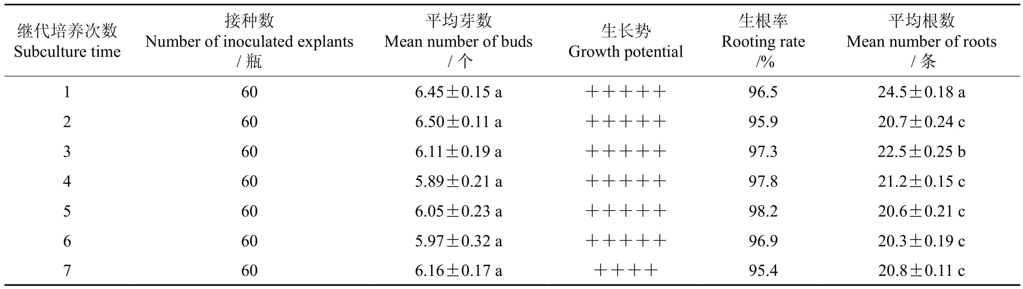 继代培养的次数对多花黄精生根的影响达到了显著差异水平,随着继代培养次数的逐渐增加,平均生根数呈下降趋势。当继代培养次数由1增至6次时,平均根数下降了4.2条。但就整个多花黄精生根系统而言,当继代培养到第7次时,每块根茎芽体上生长根数的平均值依然高达20.8条,且其生长势旺盛,根多芽青,不影响后期苗木移栽成活率。因此,综合考虑多花黄精工厂化育苗系统认为,继代培养7次后的生根培养不影响苗木生产,较为适宜。