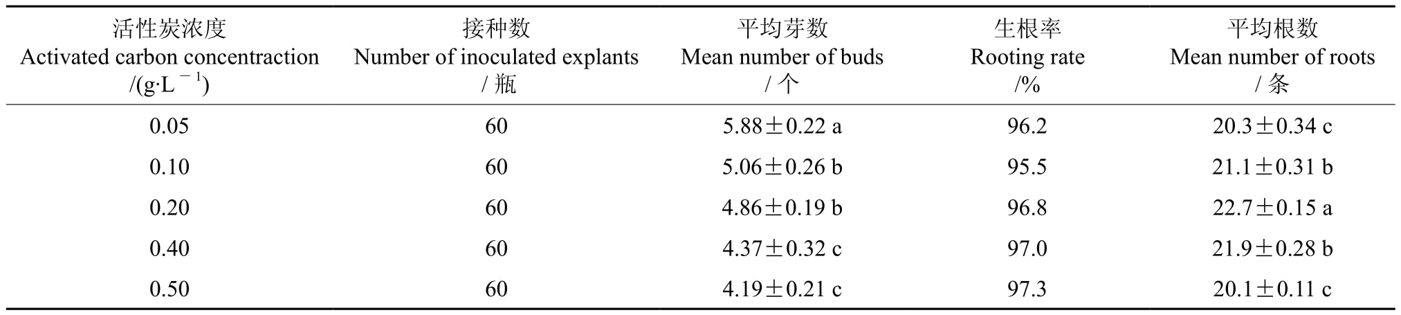 表4 含有不同浓度活性炭的培养基对多花黄精茄子视频成人在线观看苗增殖和生根的影响