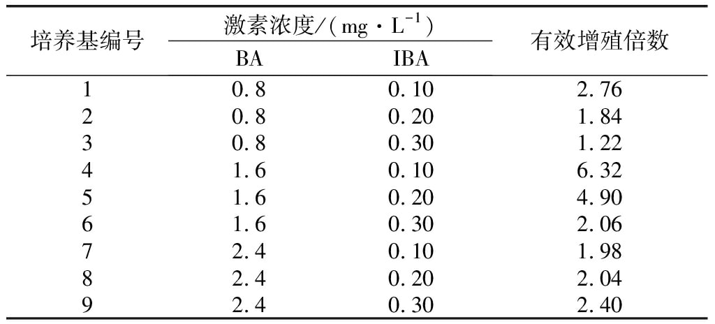 表2 增殖培养基不同激素浓度配比表 mg·L-1