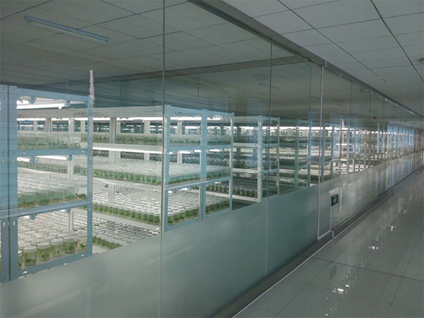 将初代培养长出的茎剪成1.5-2厘米长茎段转接到增殖培养基中。30-35天增殖5-7倍,增殖苗生长健壮。