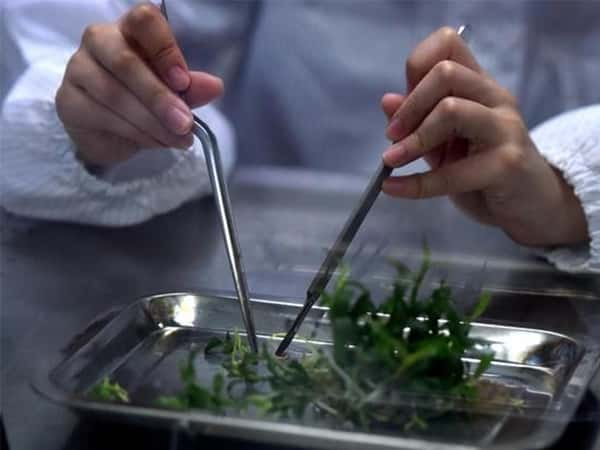 在超净工作台上将经预处理的试材用镊子剥除芽外部的叶原基,去除木质部,切下1mm大小的茎 尖,接种于分化培养基F14+蔗糖30 L+琼脂7 L上培养。培养温度25±2cC,光强2000-2500K. 每天光照l6小时。