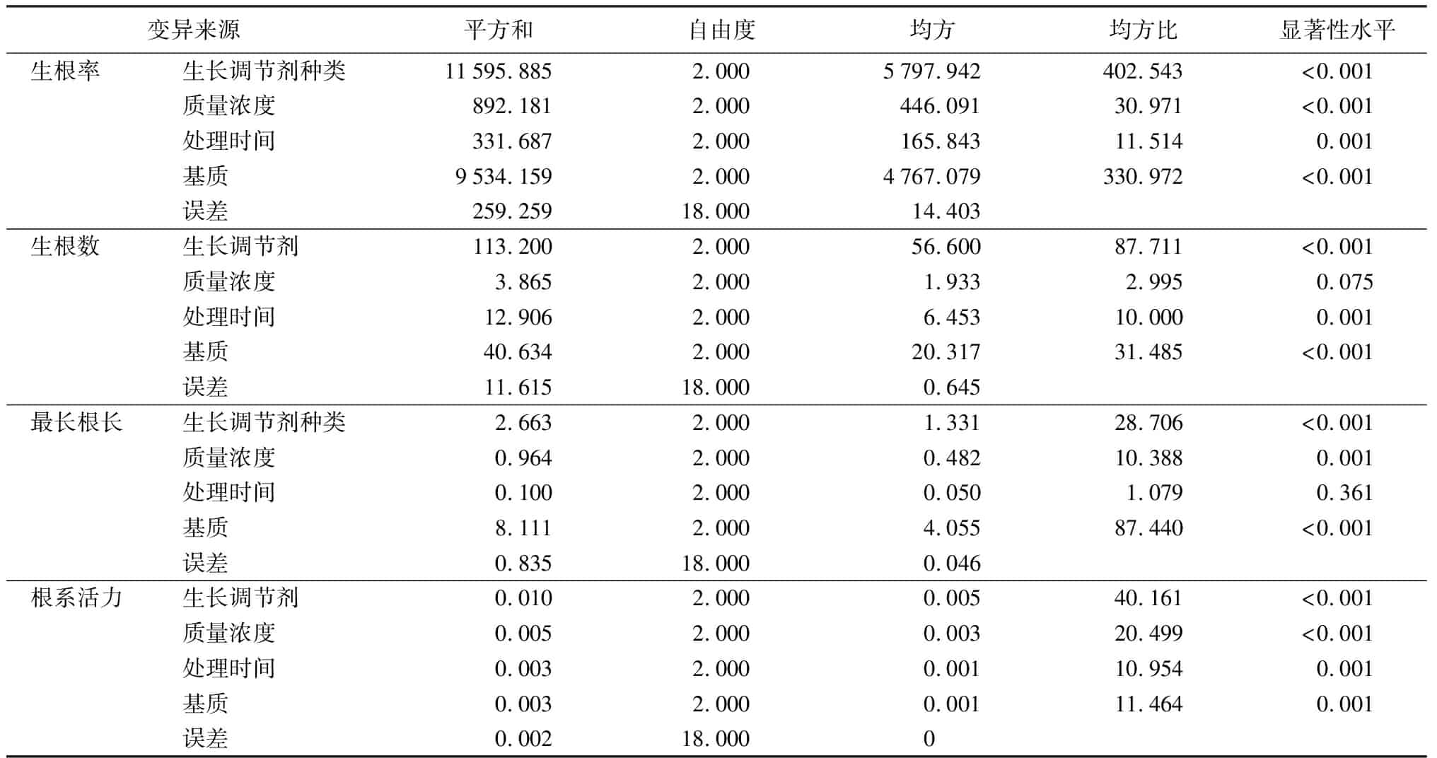 由表4可以看出,各处理因素下茄子视频成人在线观看苗很长根长的均方比由大到小的顺序为基质、生长调节剂种类、质量浓度、处理时间,除处理时间对很长根长影响不显著(P>0.05)外,其他3个因素对很长根长皆有显著影响(P<0.05)。