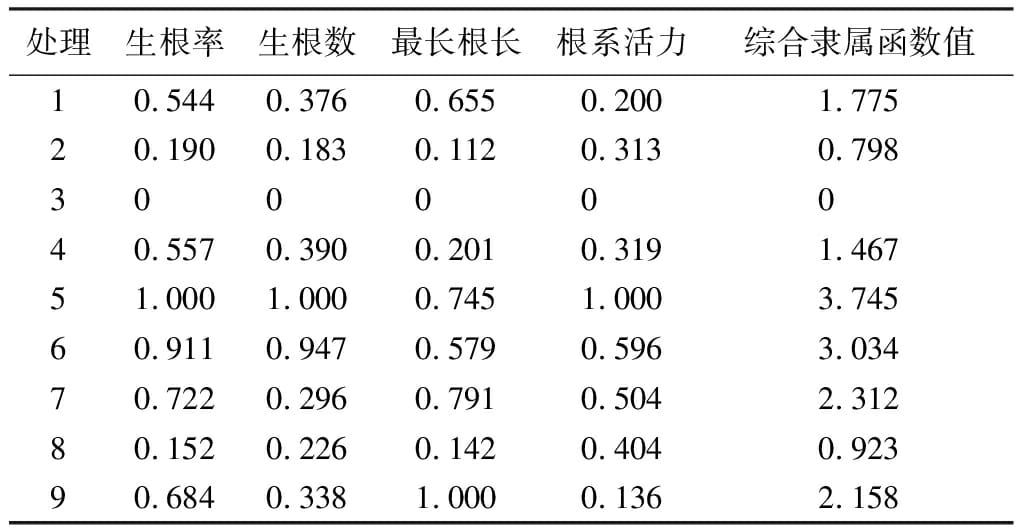 利用SPSS16.0软件和Excel 2003对所测数据进行方差分析和多重比较,通过隶属函数法对生根效果进行综合评价。
