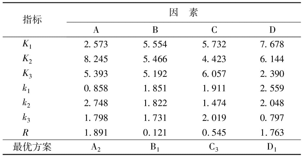 注:K为不同处理中各个因素对应的各个水平的数值之和;k为K的平均值;R为极差。