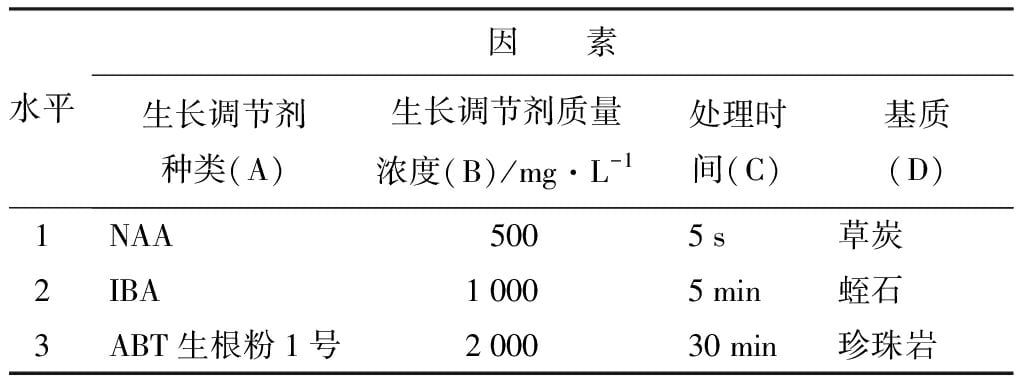 试验材料为江苏省林业科学院提供的轮生冬青‘奥斯特’茄子视频成人在线观看苗。参考课题组前期对于乌饭树茄子视频成人在线观看苗瓶外生根的研究以及在卫矛茄子视频成人在线观看技术研究中的试验设计,采用L9(34)正交表,设置生长调节剂种类、质量浓度、处理时间和基质4个因素,每种因素3个水平,不考虑交互作用(表1)。随机以50根插穗为1个处理,共有9组处理组合,重复3次。
