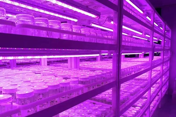 将培养容器的盖子打开,在自然光下进行开瓶炼苗3-7天,正午强光或南方光照较强的地区应该注意要采取遮阴措施,如用遮阴棚或温室避免灼伤小苗。如果在培养容器中开盖培养不够1周,一般不会引起含蔗糖培养基的污染问题。开瓶炼菌可以分阶段进行,即首先开盖一两天,然后部分开盖一两天,然后完全揭去盖。这种方法在相对湿度十分低的屋内特别有好处。培养容器的开口大小也影响开盖的速度,开口大的瓶盖应比开口小的瓶盖除去的速度慢一些。