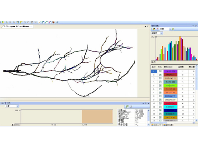 能进行根系的颜色分析,确定出根系存活数量,输出不同颜色根系的直径、长度、投影面积、表面积、体积;